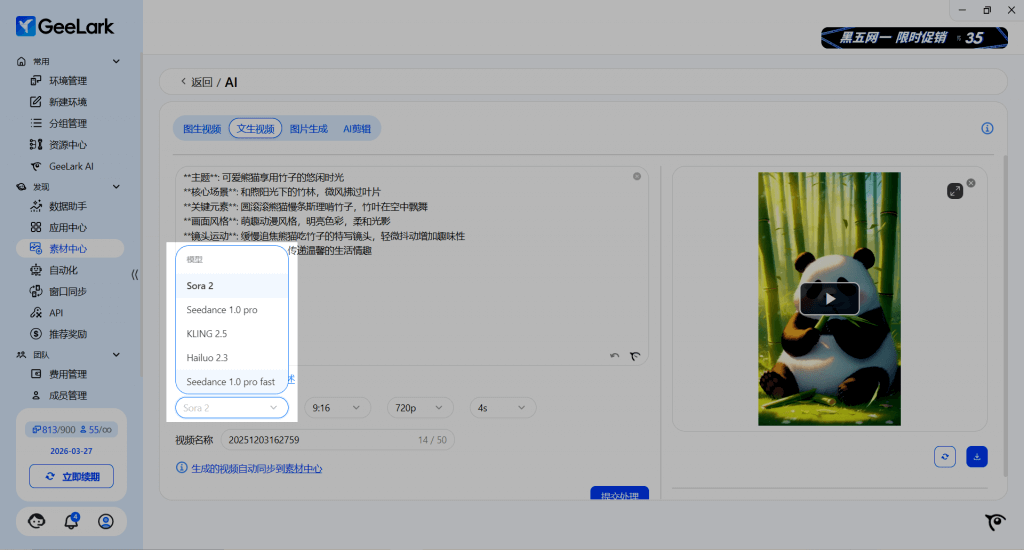 在 GeeLark 最新版本中,「AIGC 文生视频」现已接入 Sora 2、KLING 2.5、Seedance 1.0 pro fast 和 Hailuo 2.3 大模型。你可以根据自身特定的工作流程和需求,在平台内组合使用不同的模型,显著提升你的跨境运营效率与市场竞争力。