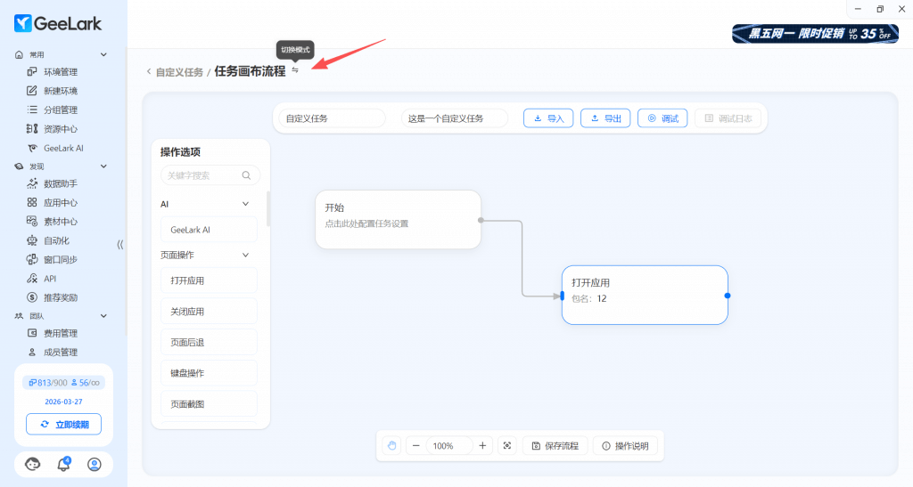 在 GeeLark 的最新版本中,自动化栏目新增了浏览器自定义任务板块。通过切换“浏览器环境”板块,你可以自定义任务流程,并根据需求设置指纹浏览器相关运营自动化操作。