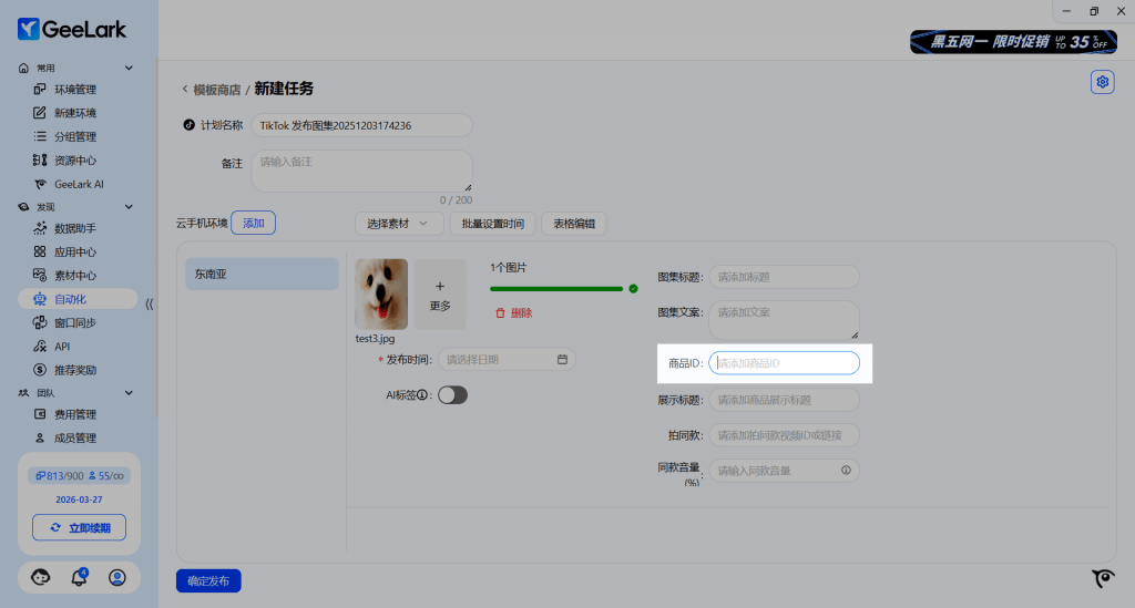 在 GeeLark 最新版本中,在“自动化”栏目选择「TikTok 发布图集」自动化模板,添加任务后可以选择手动输入你的商品 ID。