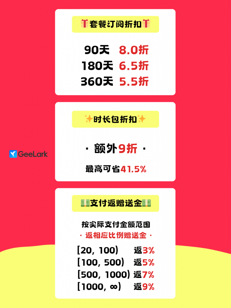 Hey,这是我给你找的优惠! 更新时间2026年3月20日 首页 / 博客 / Hey,这是我给你找的优惠! 🧨GeeLark 订阅福利狂欢 👇三重 buff 叠满✅套餐订阅折扣,越长越划算✅时长包折扣,最高省41.5%✅支付返赠,余额直接用⏰活动时间:2026年4月2日 截止现在订阅,用更少的成本,解锁更高效的全球运营体验✨