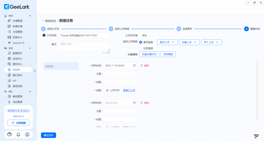 4. 确认设置无误后,可点击左下角“确认发布”,后台开始根据你的设置自动在 Threads 上发布视频 。在任务日志/计划管理中可查看定时/循环任务的运行状态,便于你及时做出运营调整。