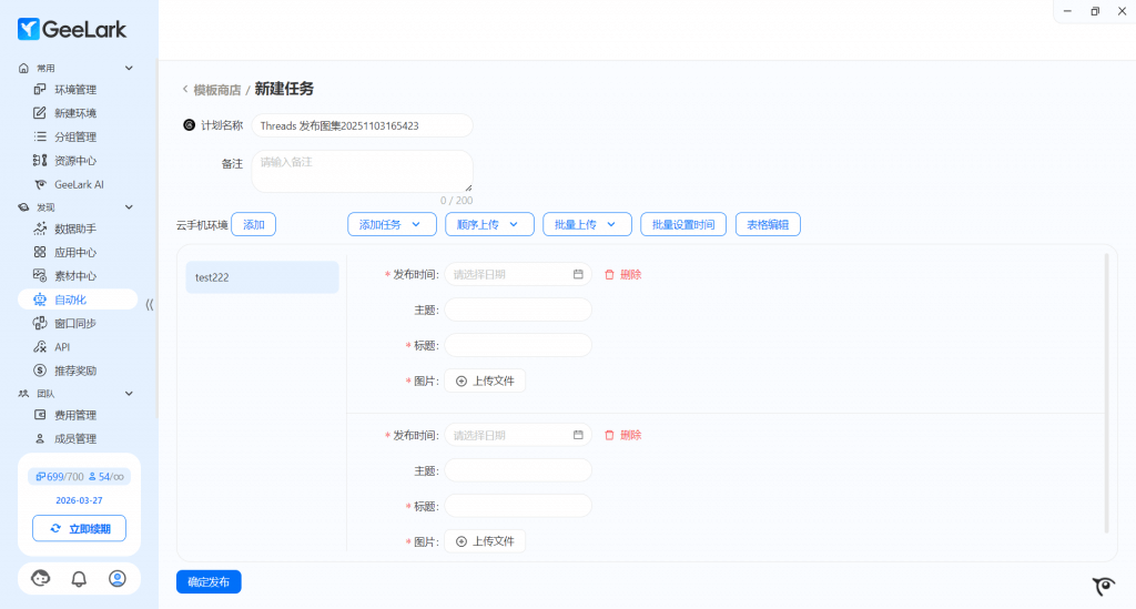 3. 在添加任务时,你可以具体设定多云手机环境、多项任务,还可以批量设置运行时间。唤醒右下角的 GeeLark AI 能帮助你编写视频标题,你也可以填入“主题”,参与更有指向性的高热度话题讨论;
