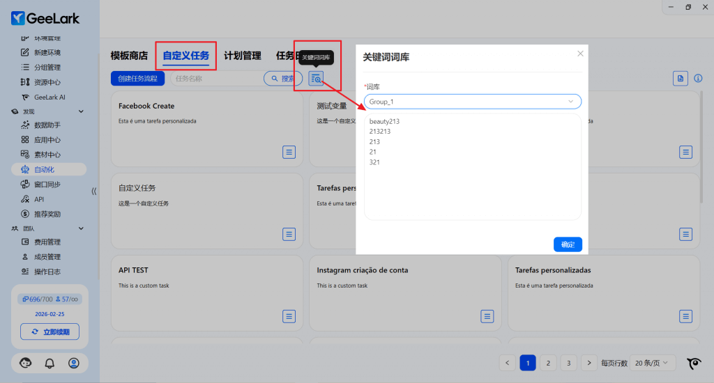 在“自动化”栏目选择“自定义任务”,点击“关键词词库”进行设置,你可以按照不同的领域或专业内容设定相关分组,在每个分组内输入相关关键词,这样就已完成你的专属跨境词库设置。