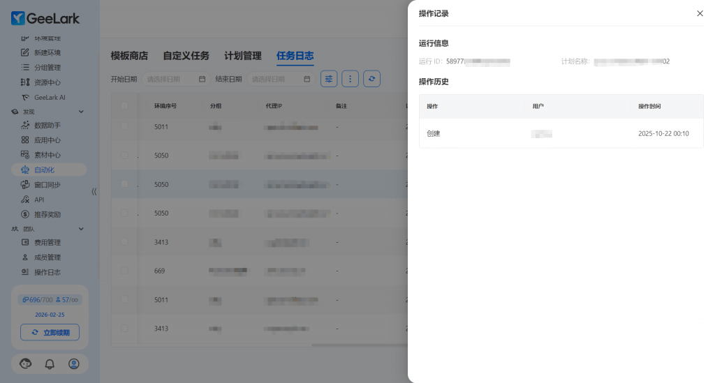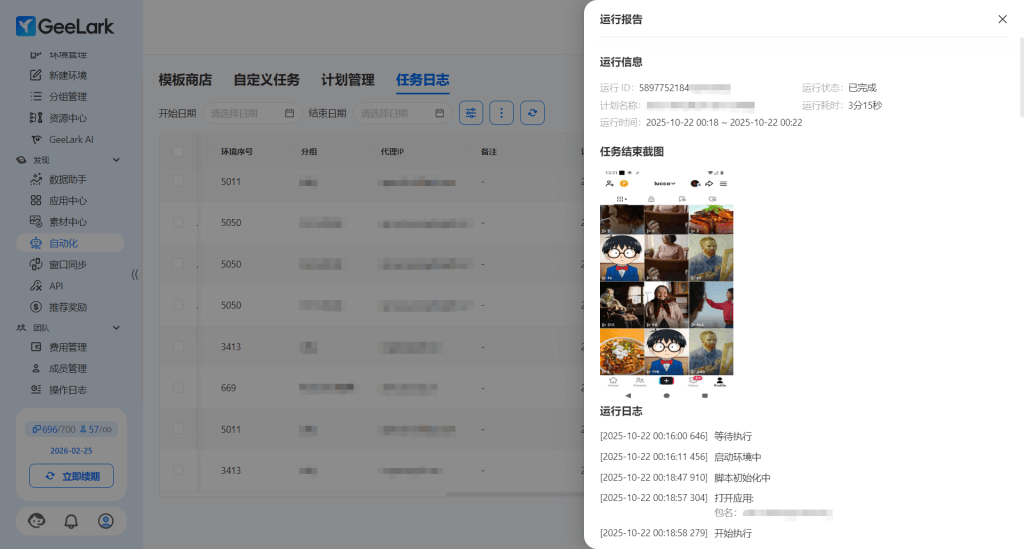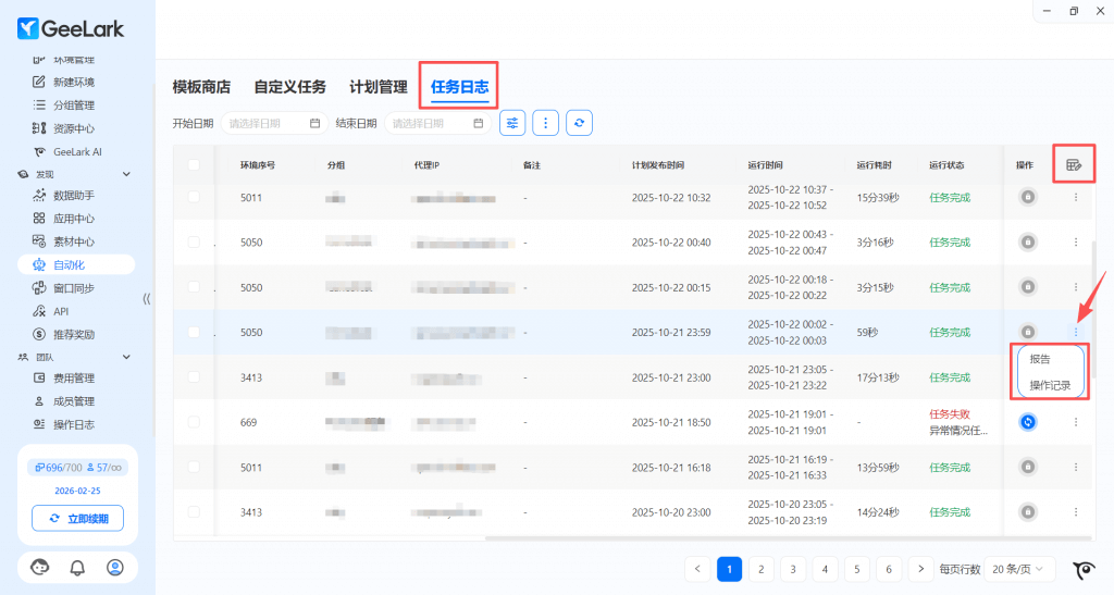 在 GeeLark 最新版本中,“自动化”栏目的“任务日志”里,你可以点击最右方三点,查看对应环境的用户操作记录和运行报告。