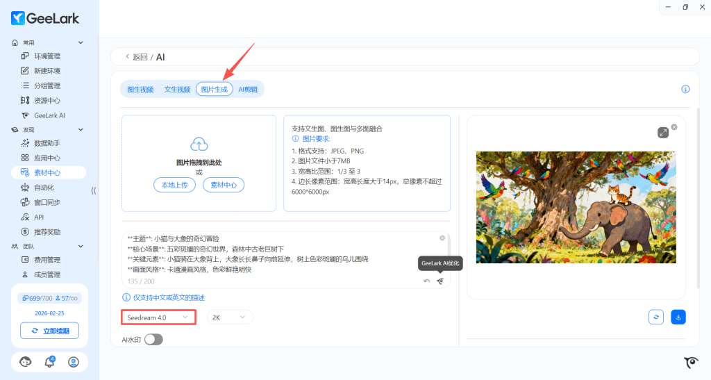 在 GeeLark 最新版本中,AIGC 新增图片生成功能,现已接入Seedream 4.0大模型。此功能支持文生图、图生图与多图融合,你可以根据自己的要求填写文案或上传图片,通过 GeeLark AI 优化文案,不断调整提示词,轻松生成更符合你运营风格的图片。