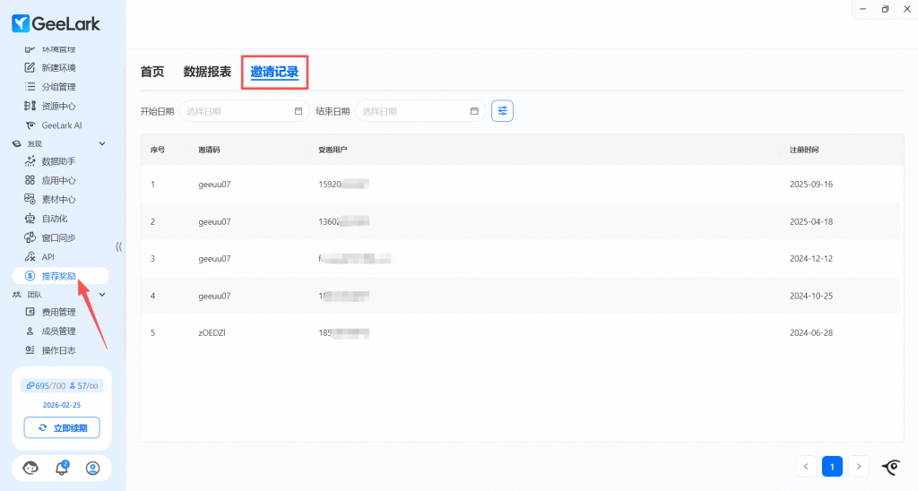现在,当你参加推荐奖励计划,新用户通过你的邀请码使用 GeeLark 时,你可以通过“推荐奖励”-“邀请记录”清楚地看到自己发出的每个邀请码的状态。