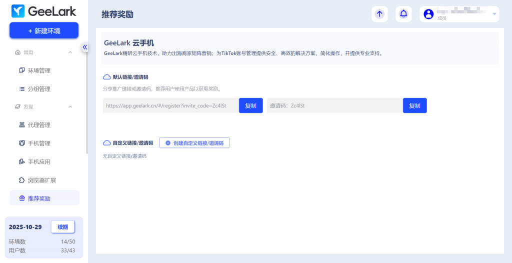 此次更新增加了「推荐奖励」模块。你可以通过分享推广链接或邀请码,邀请朋友使用GeeLark云手机。邀请码分为两种:
