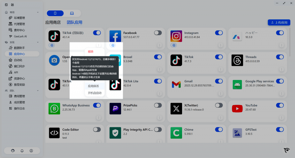 A:一般在云手机跑脚本等场景下,需要对某个 App 保持应用在后台持续运行时,你可以选择「应用保活」。