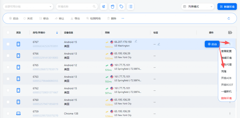 A:选择「环境管理」-在最右方选择「克隆」功能,该功能为克隆相同的云手机型号和设置等,对于原来云手机环境的 App 和数据无法克隆。