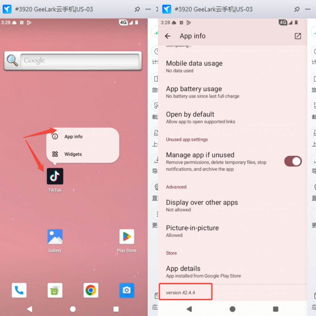 A:在云手机里,你可以通过长按 App 图标,点击 App info,在底部能够确认是否为你想要的版本。