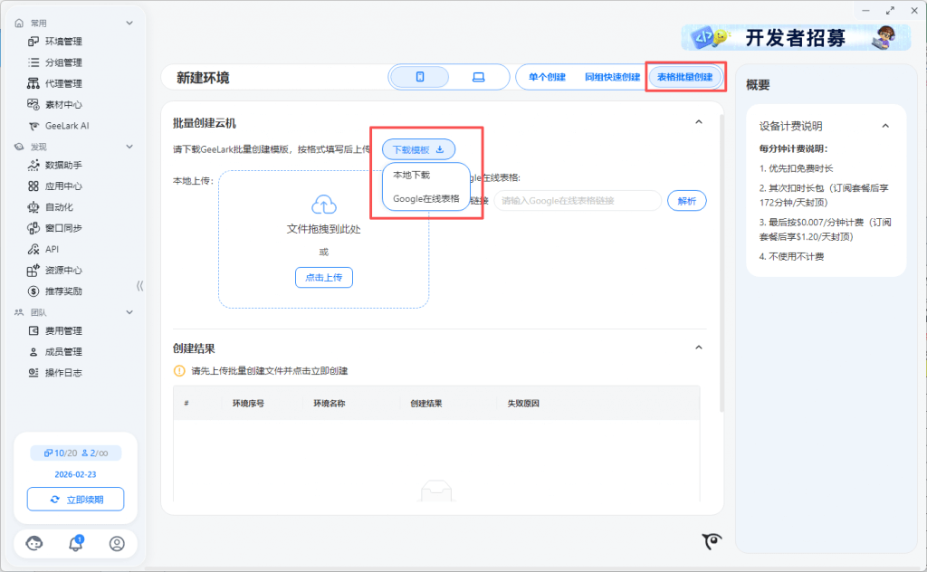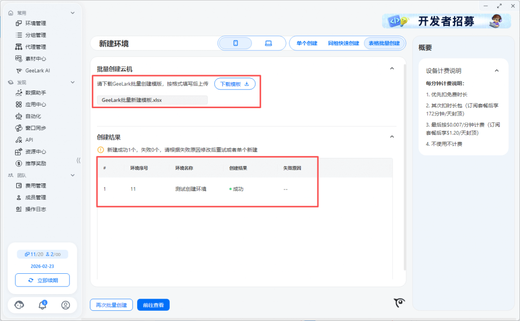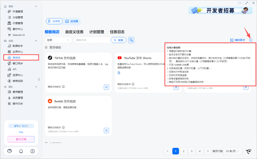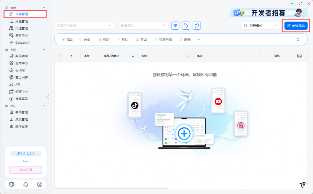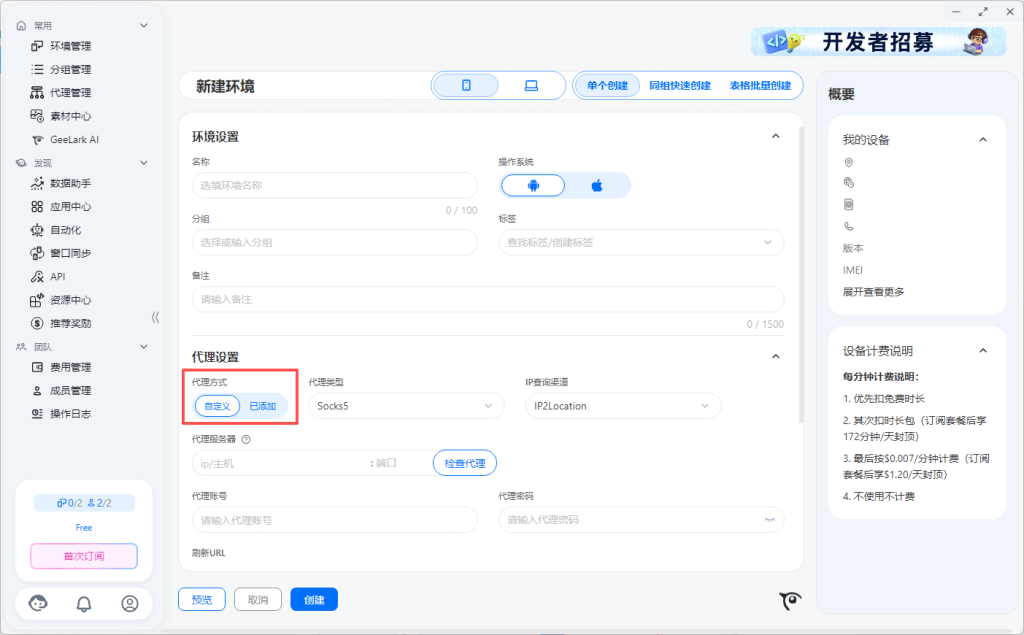 Free套餐:免费套餐提供2个环境数,可同时创建2台云手机设备