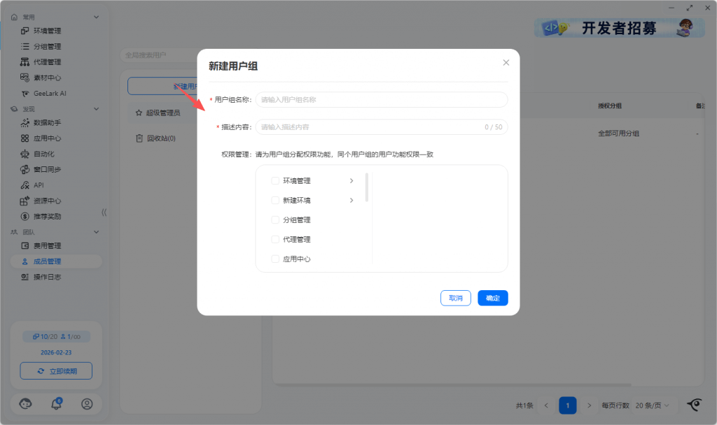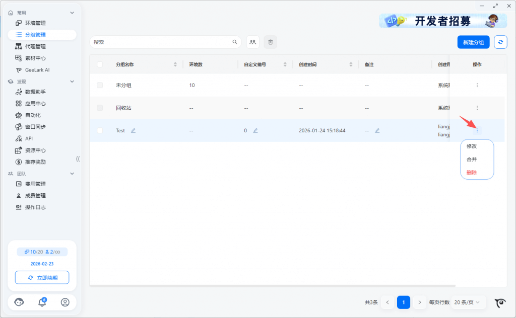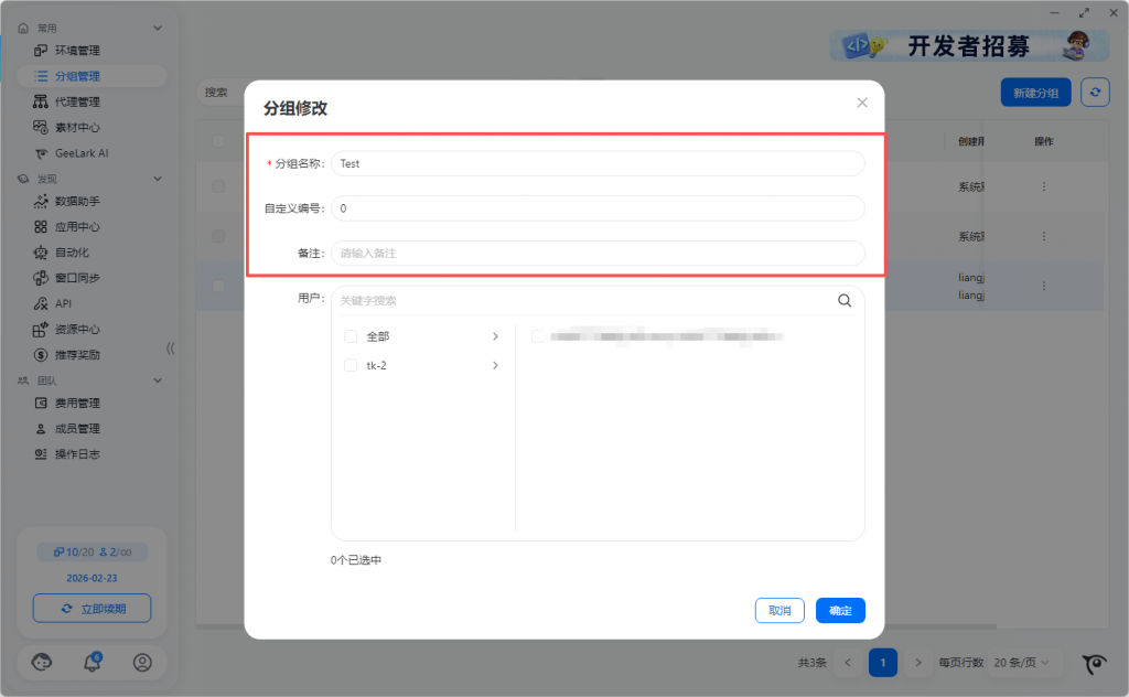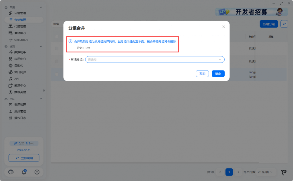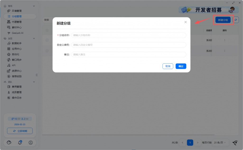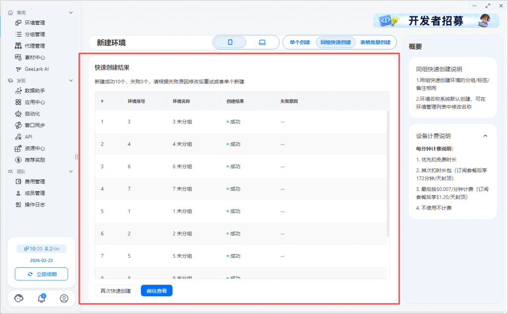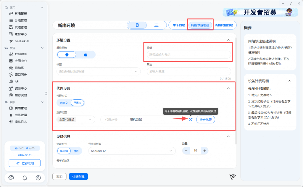 2.1 同组快速创建环境的分组/标签/备注相同,环境名称系统默认创建,可在环境管理列表中修改名称。代理信息支持选择代理分组,随机匹配选中代理分组的代理
