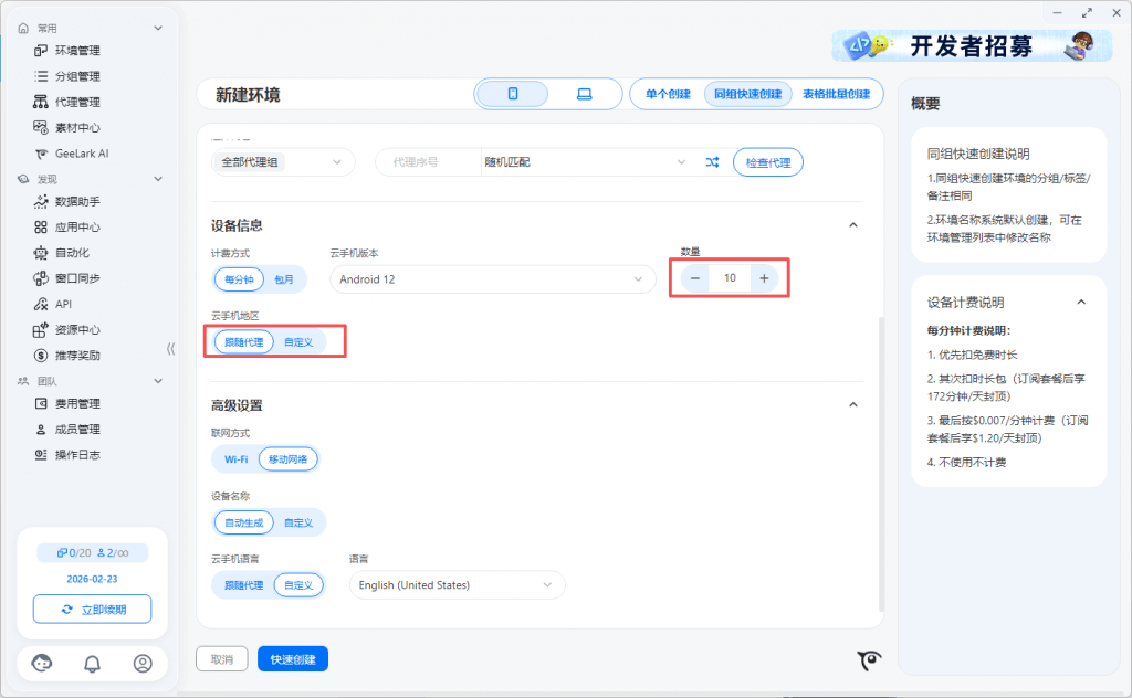 2.2 设置创建的云手机设备数量,选择云手机地区,可以跟随代理匹配或自定义地区,再点击快速创建