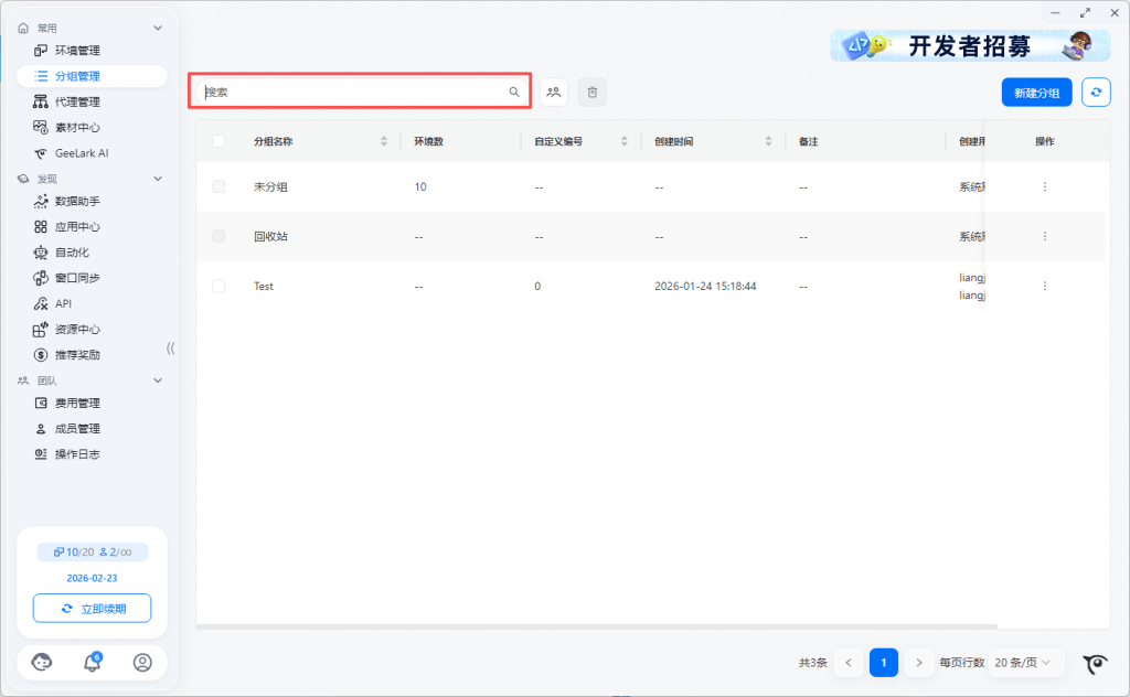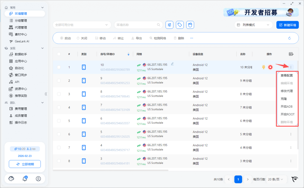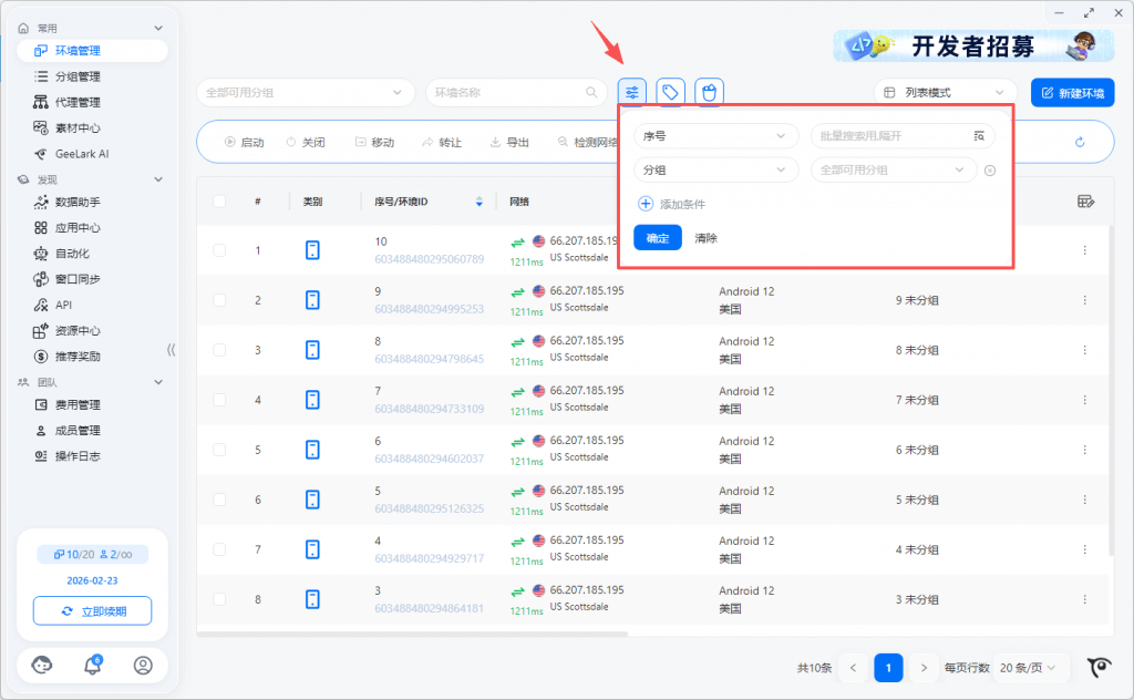 - 环境列表支持按分组、类别等筛选环境;云手机环境展示各自已关联的云手机设备信息