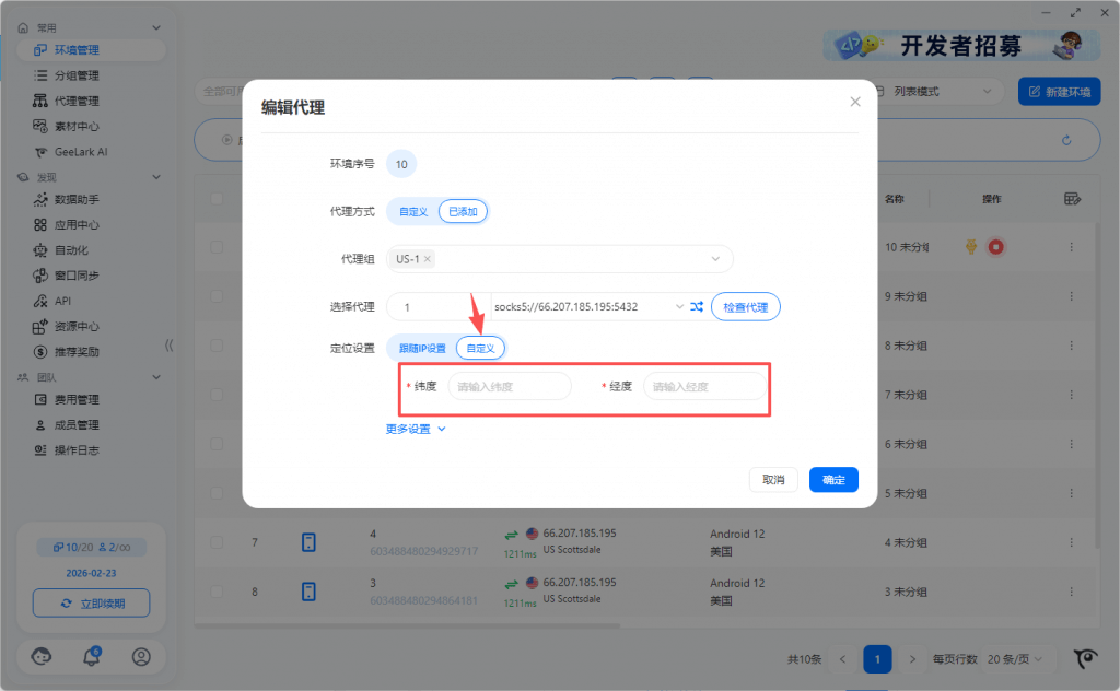 - 当环境关闭时,可以进行修改代理、一键新机等编辑操作。定位设置在修改代理中,可选择跟随IP,同时支持自定义经纬度。