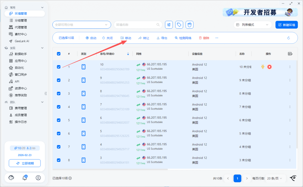 选择多个云手机环境,点击更多开启 ADB
