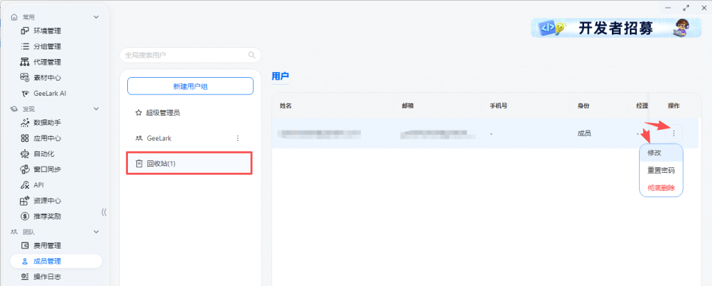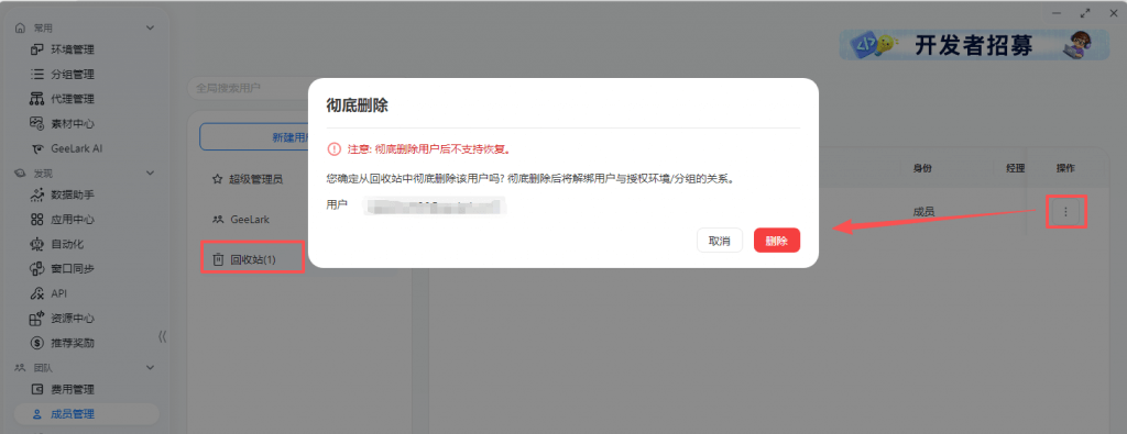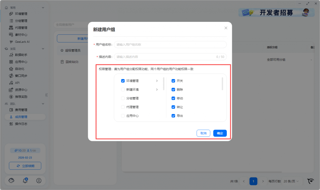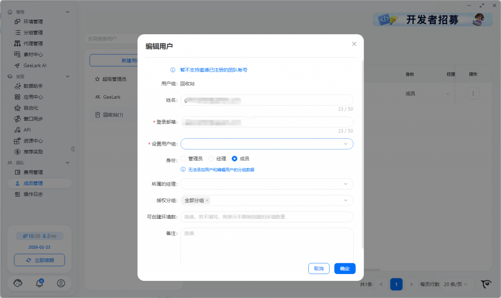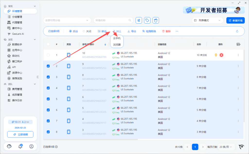 - 转让环境:勾选环境点击转让,可将该云手机环境转让给其他 GeeLark 账号