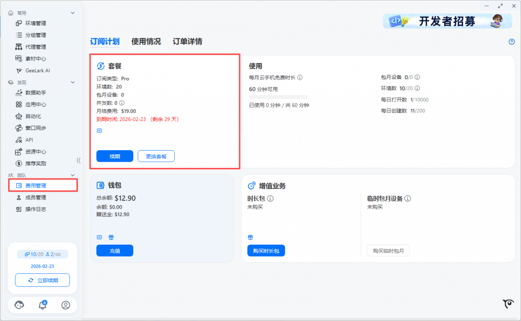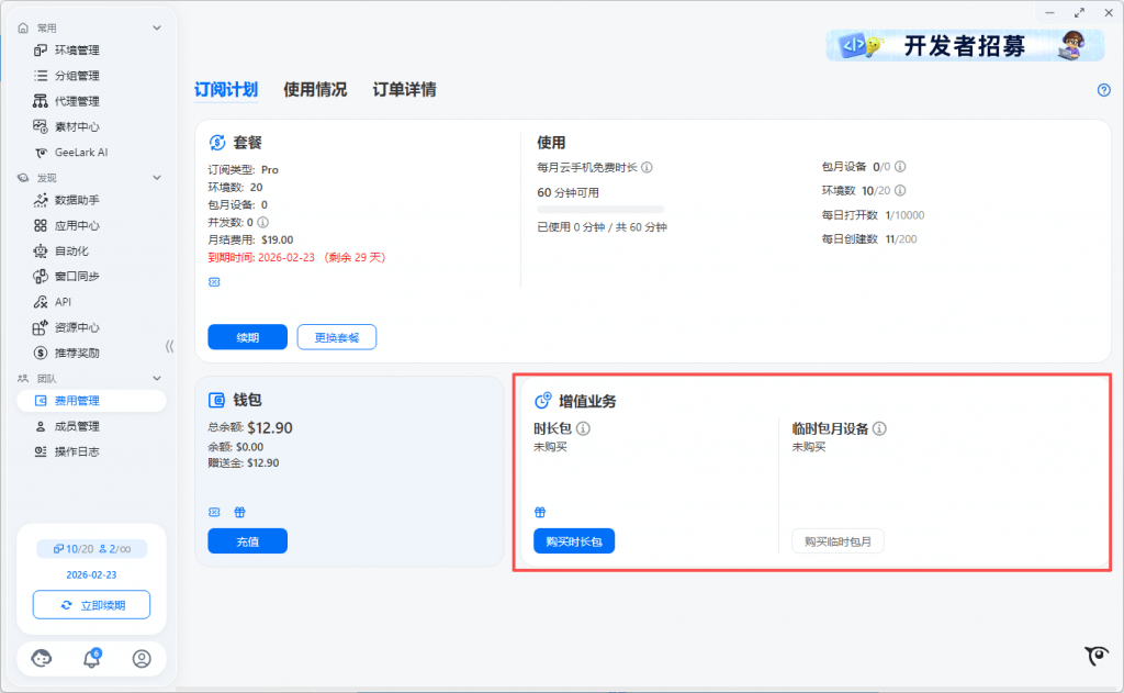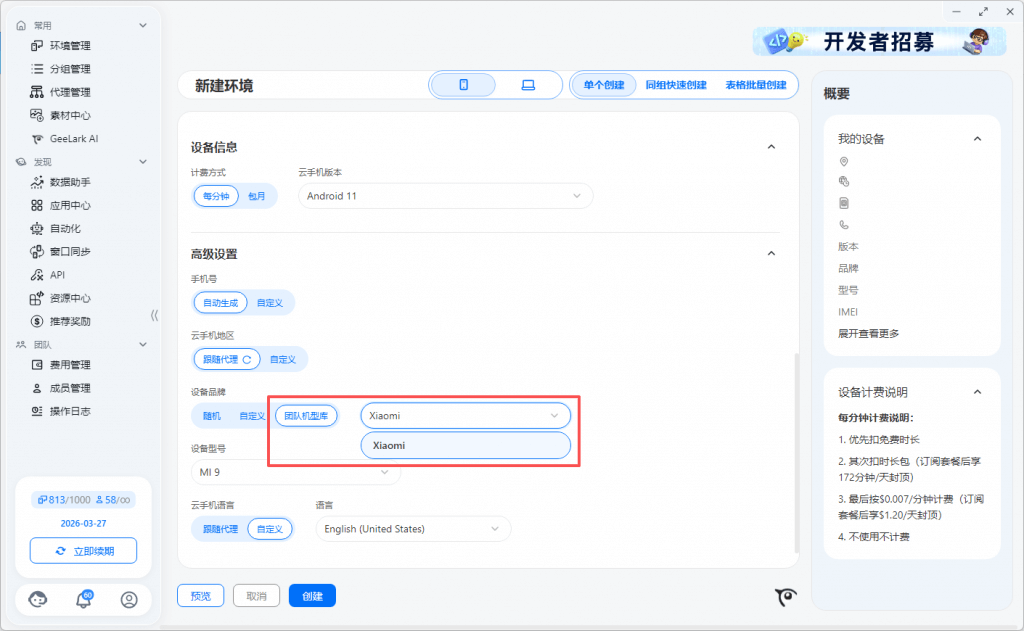 例如,Base 10个环境数套餐赠送60分钟的免费使用时长。该免费时长是所有的云手机设备共享这60分钟,可以选择一个云手机设备上连续使用60分钟,或在10个云手机设备上每台使用6分钟。每个月套餐赠送的免费时长用完后,打开使用云手机将按 $0.007/分钟 计费,单设备单日费用上限:$1.20