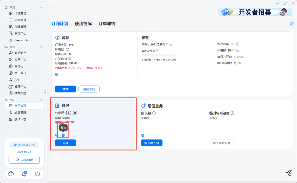 云手机按照使用开机时长计费,费用将从您的钱包余额进行扣除,所以当您的钱包余额不足时,将无法打开云手机使用