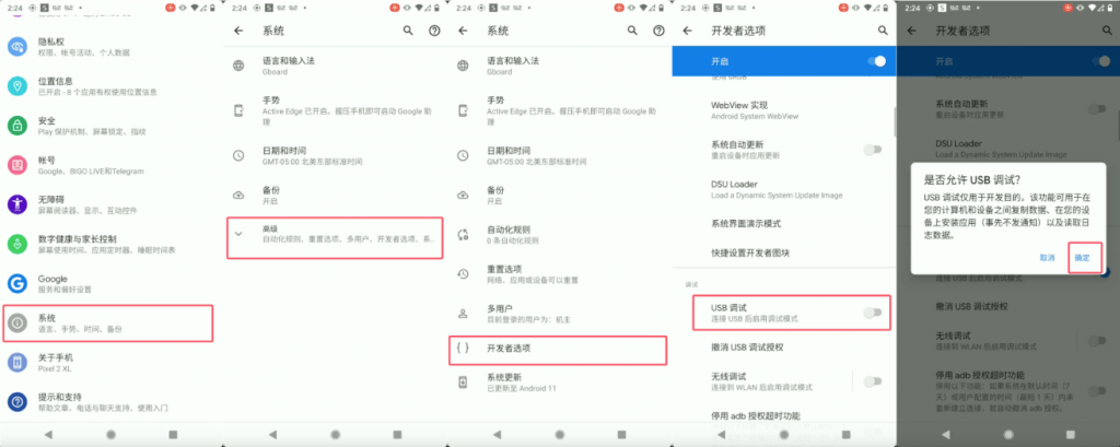 3. 开启USB调试:设置-系统-高级-开发者选项-开启USB调试-点击确定