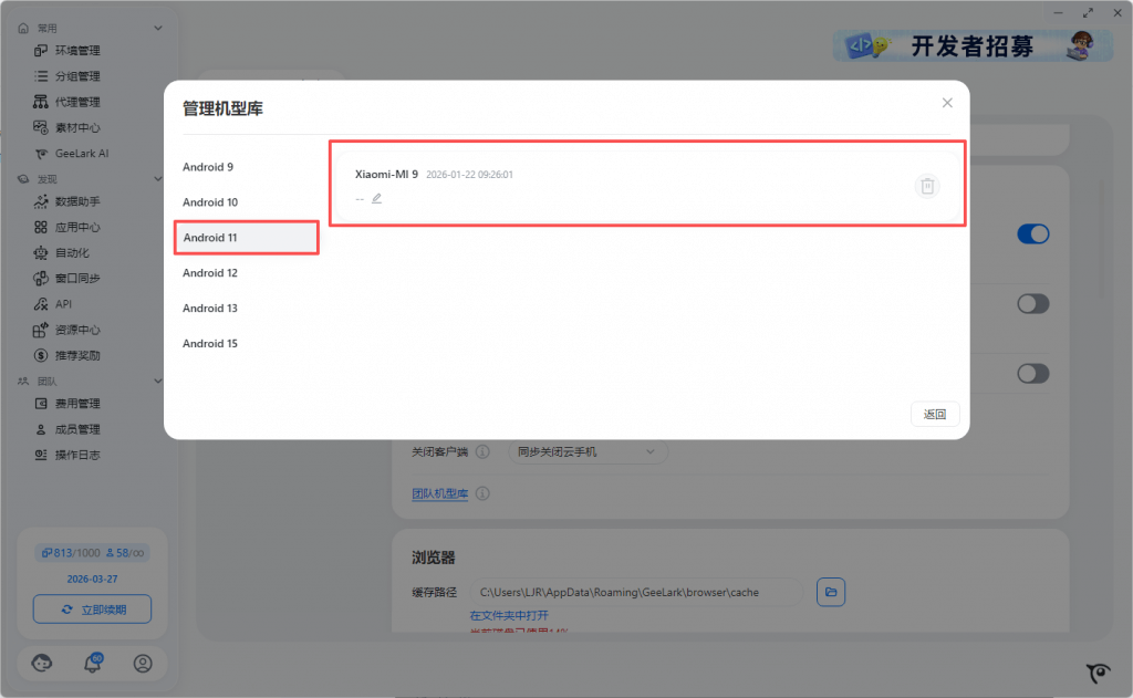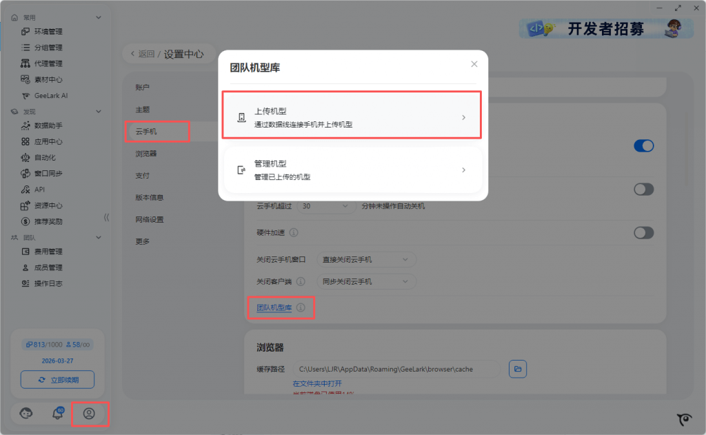 4. 在GeeLark 客户端设置中心-云手机-团队机型库-上传机型,点击开始连接-连接成功后在手机上可以应用界面