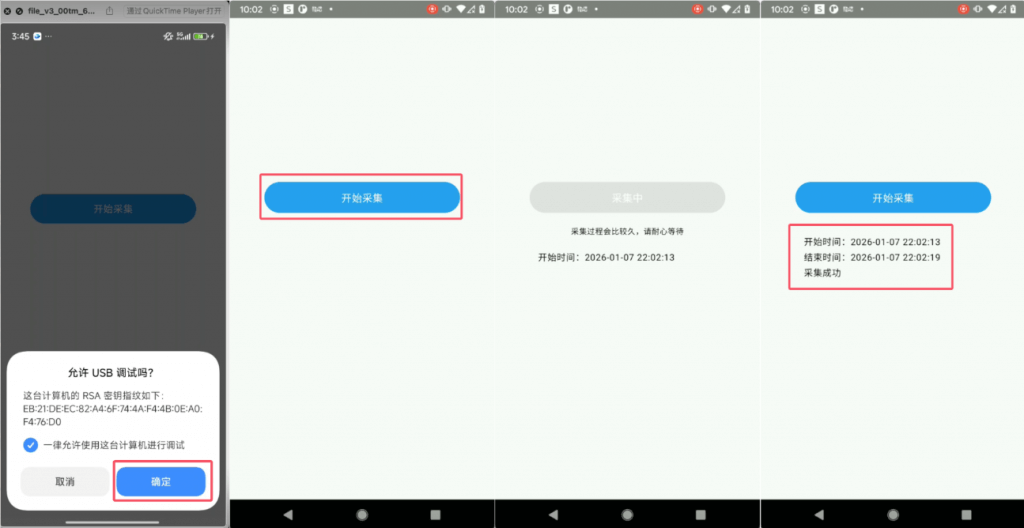 5. 在手机上打开的应用中,点击确认USB调试,点击开始采集,在采集成功后会提示对应信息