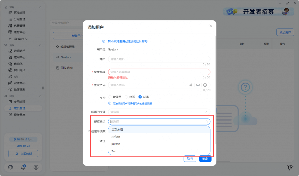 1.3 选择分组(超管账号未选择分组默认创建环境到未分组)