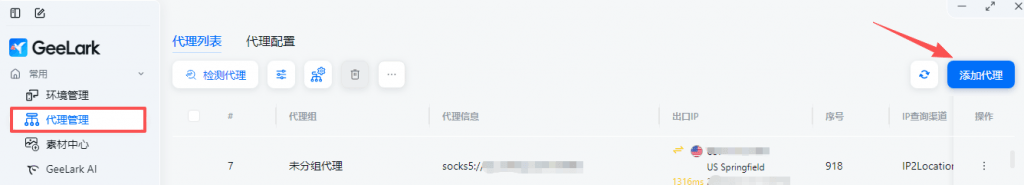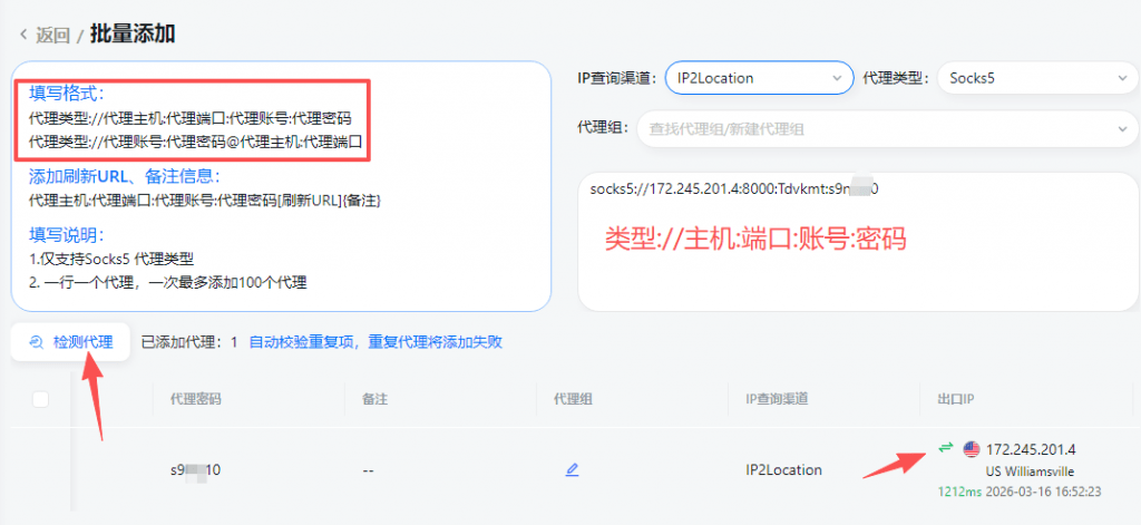 1.点击添加代理,在右侧文本框中填写代理信息(该信息仅为示例说明,请填写自行购买的代理信息)