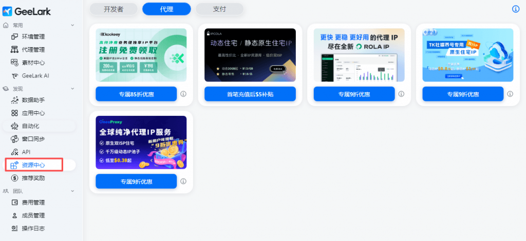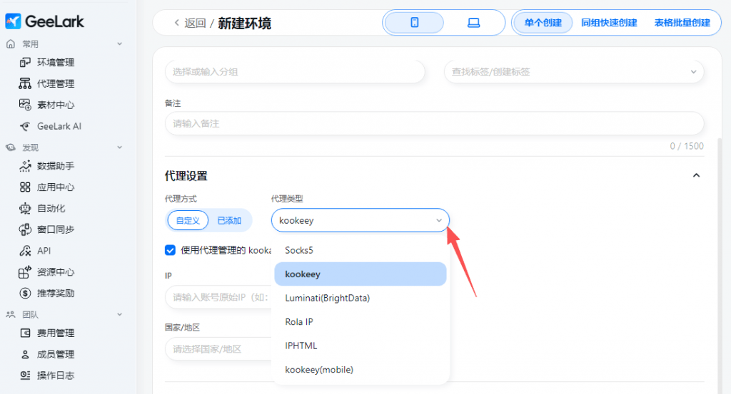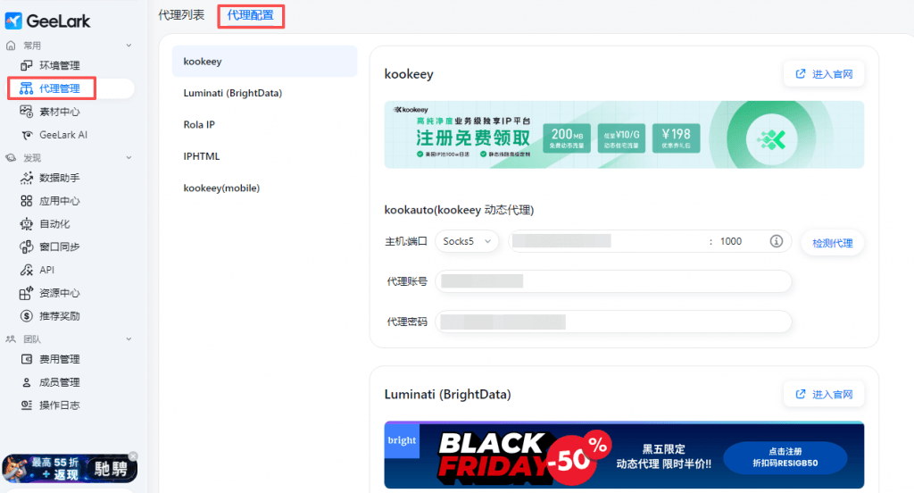 代理配置,已接入了kookeey、Luminati (BrightData)、Rola IP、IPHTML等动态代理供应商,在代理配置中填写对应代理供应商购买的动态代理信息,在新建环境时可选择该对应代理类型