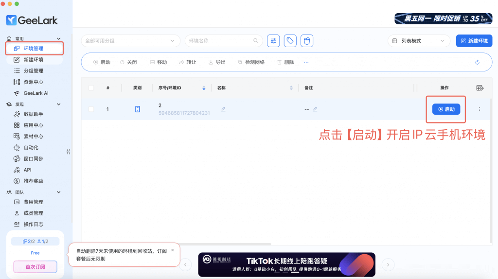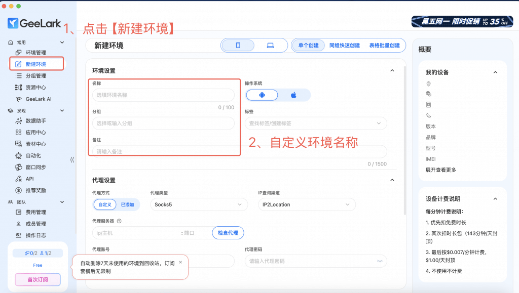 2.2 打开GeeLark,注册账号后,点击【新建环境】,自定义环境名称