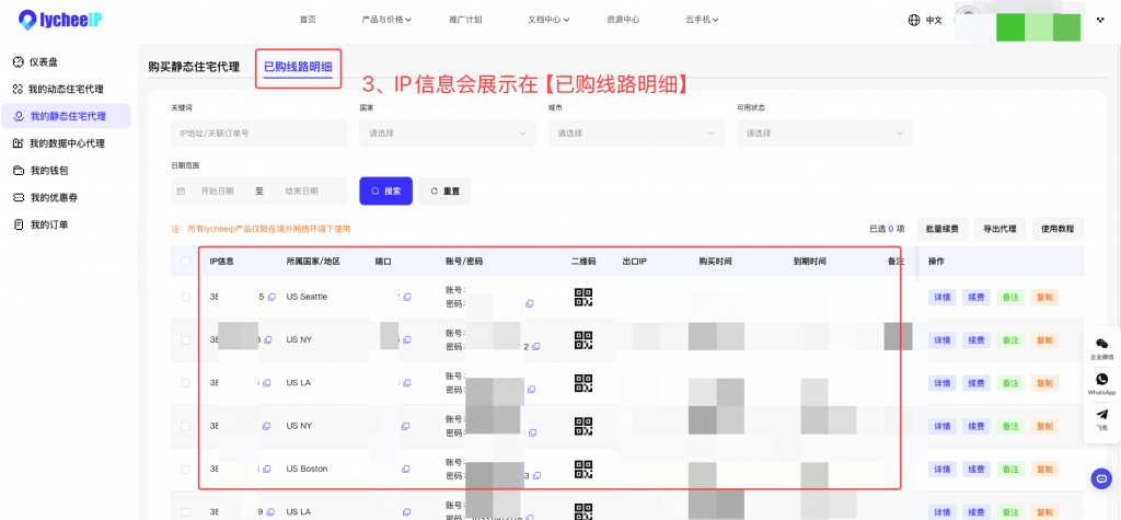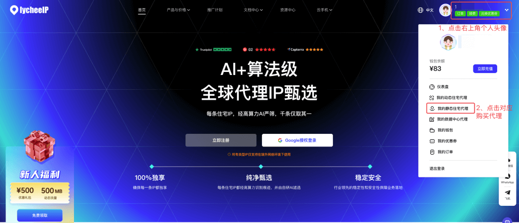 1.1 注册并登陆LycheeIP后台,根据引导流程,购买静态住宅IP(新用户注册立领¥500立减券)