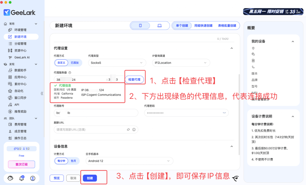 2.4 填写完成后点击【检查代理】,出现IP信息代表连接成功,点击【创建】,自动跳转至【环境管理】