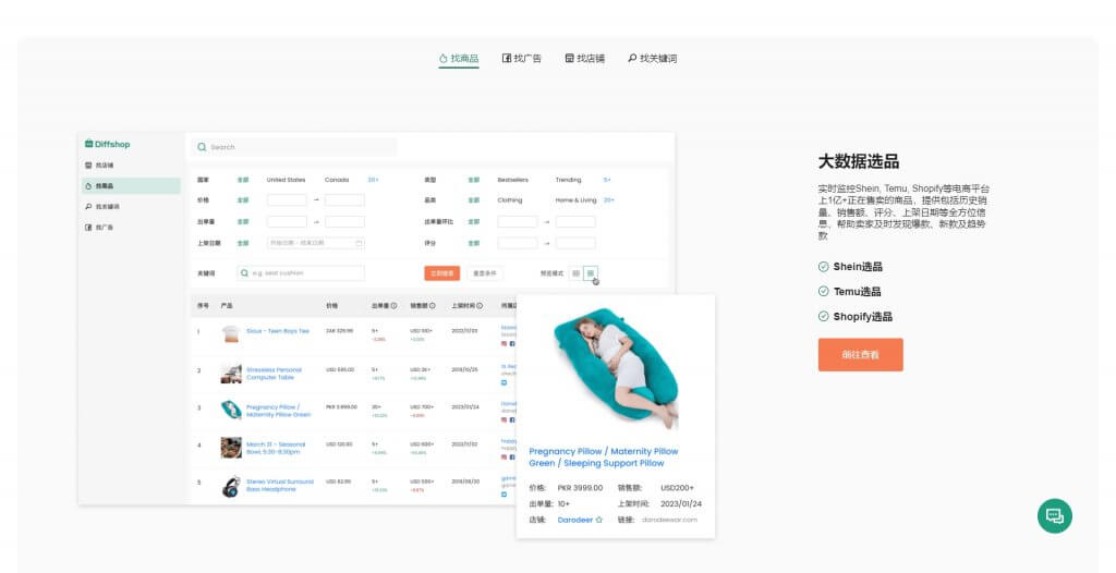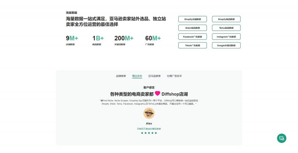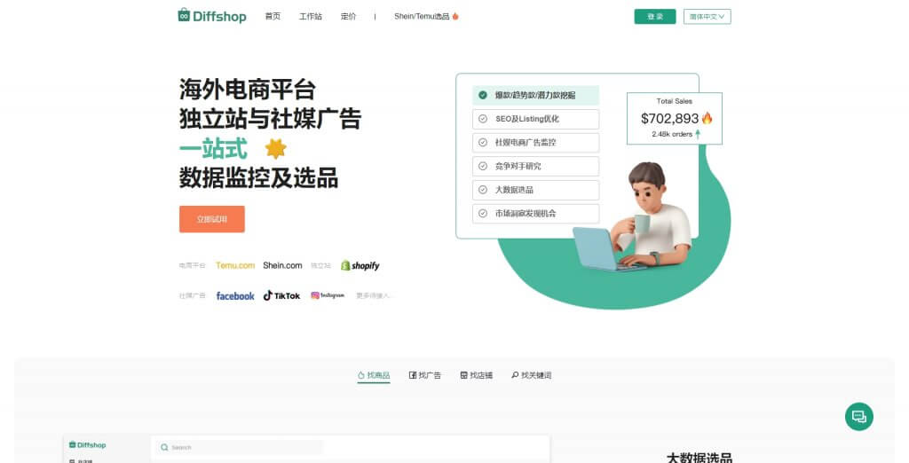 Diffshop店湖是一款海外电商平台/独立站/社媒广告一站式数据监控及选品工具。包含:Shopify店铺数据、Shopify商品数据、Shopify关键词数据、Shein商品数据、Temu商品数据、谷歌电商关键词数据、Facebook电商广告数据、Instagram电商广告数据和TikTok电商广告数据。通过实时监控热销商品、趋势商品、历史销量信息、流量、关键词、外链等全方位信息帮助卖家进行有效的市场研究、竞争对手分析、选品、SEO、Listing及广告投放优化。